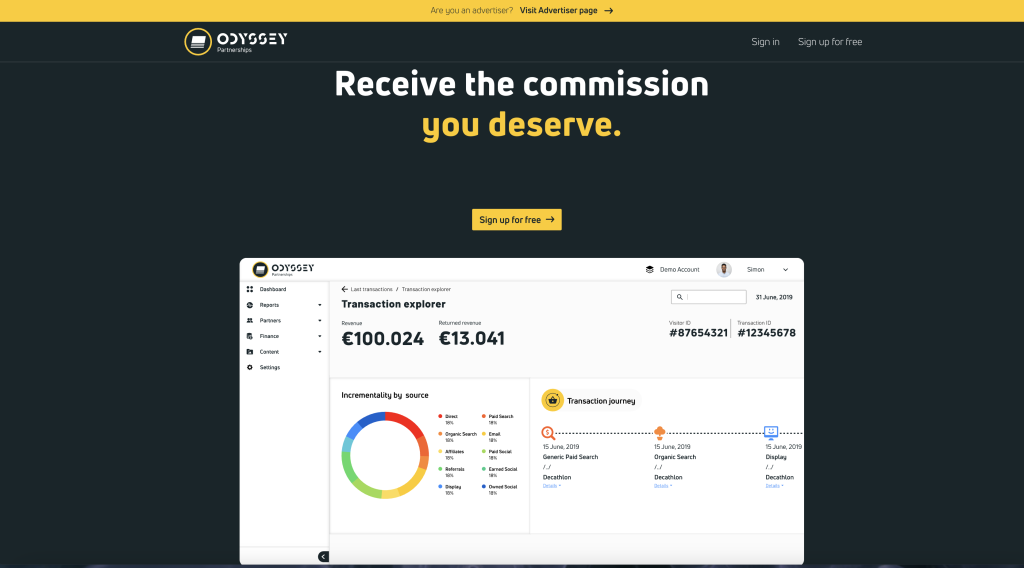 Odyssey is een affiliate platform dat merken en publishers met elkaar verbindt om online verkopen en leads te genereren. Net als andere affiliate netwerken stelt Odyssey bedrijven in staat om een partnerprogramma op te zetten, terwijl affiliates producten of diensten kunnen promoten via hun website, blog of social media kanalen. Een van de grotere bekende merken die je kunt promoten via Odyssey is Decathlon. Wil je met dit merk aan de slag meld je dan zeker aan bij Odyssey.